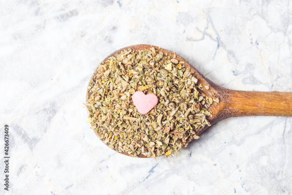 Cistus, in the form of dried leaves, in tea infusions on light background