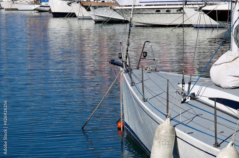 The front of a sailing yacht moored in the marina