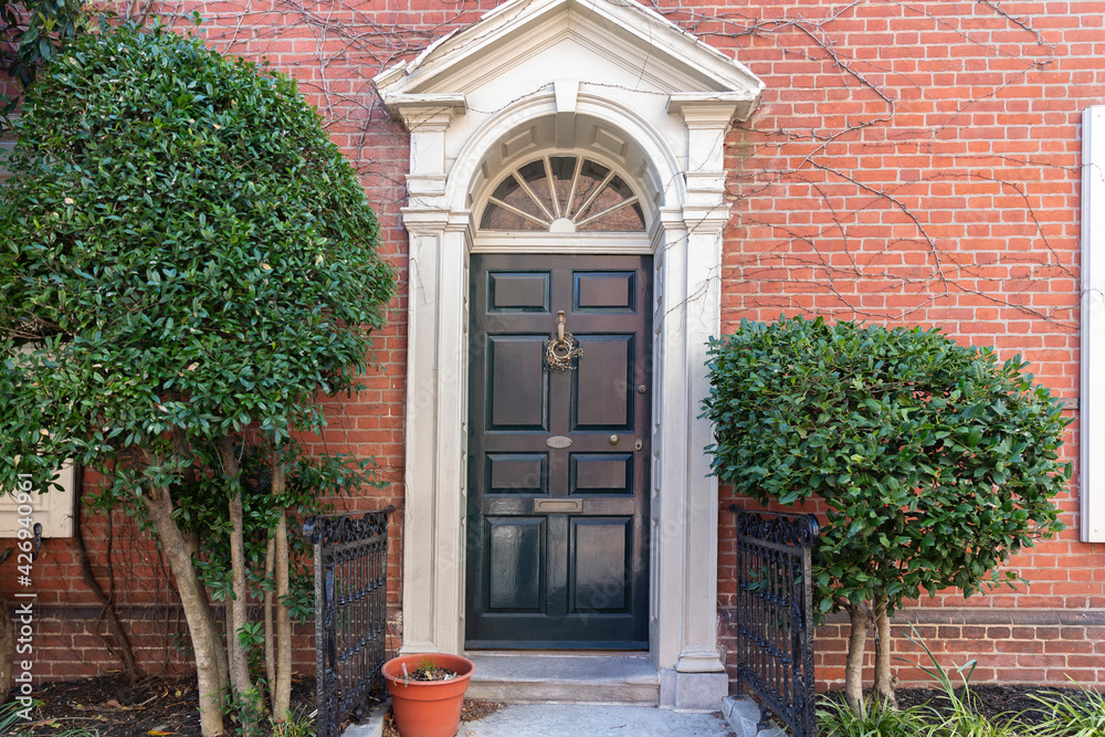 Front of brownstone apartment building in Center City with windows, stoops and planters in Pennsylvania