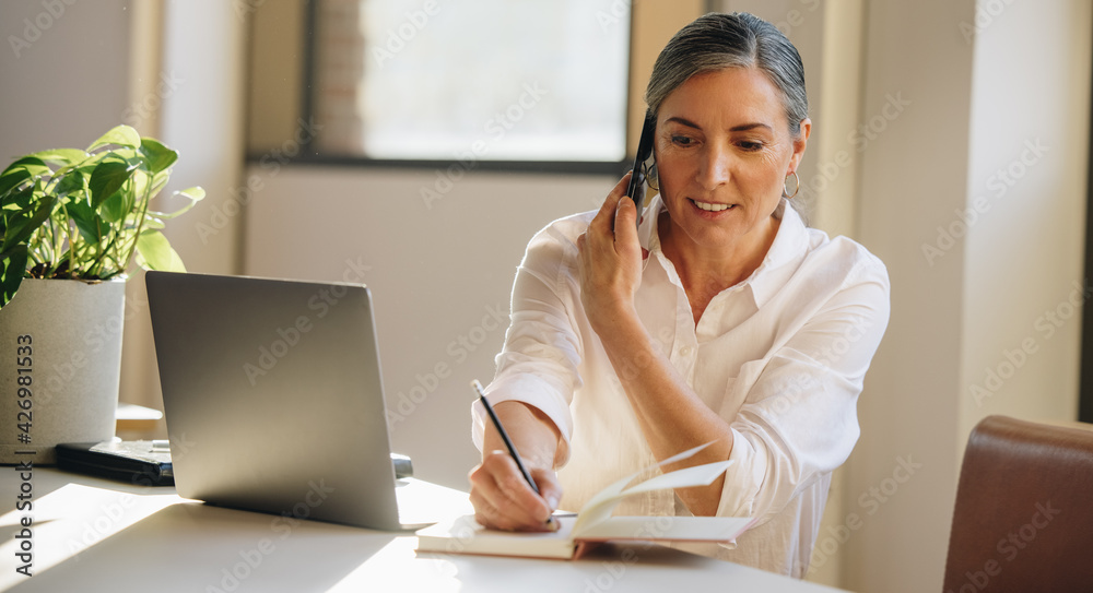 Businesswoman talking on cell phone and taking notes in office