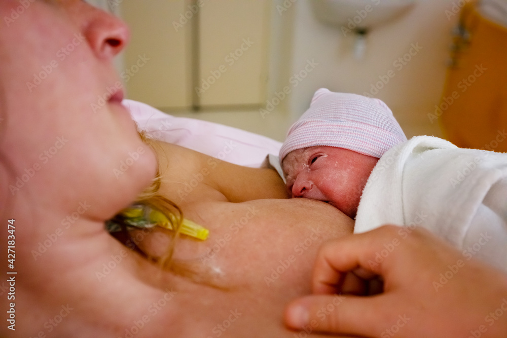 Close portrait of newborn baby breast feeding