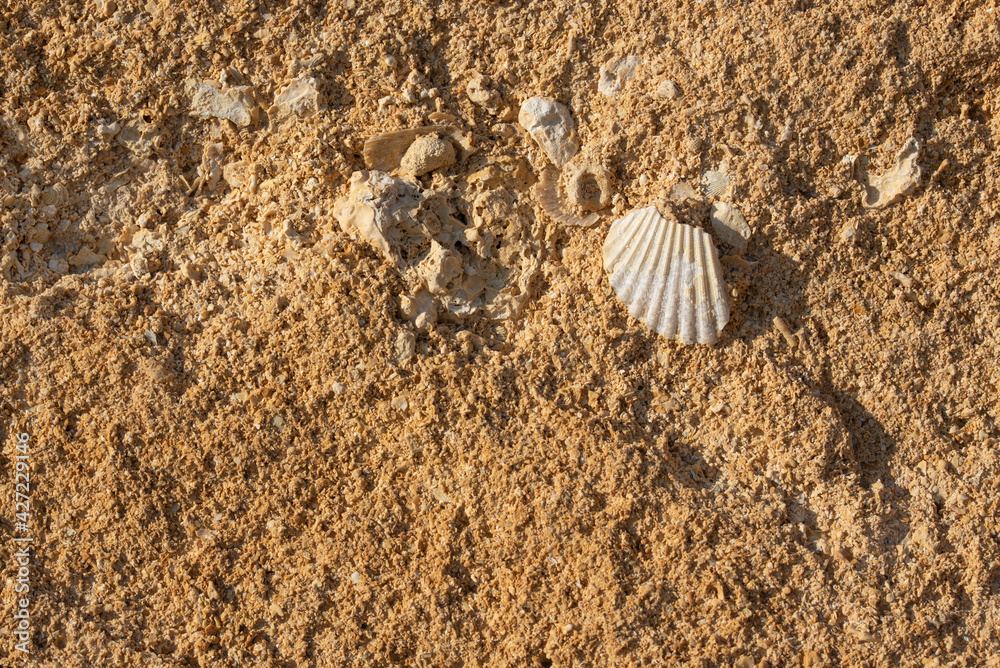 Porous sandstone forms a brown background into which pieces of a seashell are baked