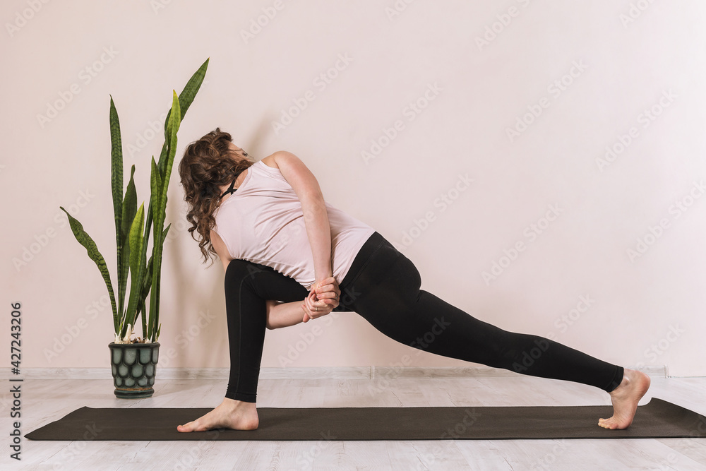 A woman in sportswear practicing yoga, doing parivritta parshvakonasana, reverse angle pose, practicing in the studio against the wall on a mat
