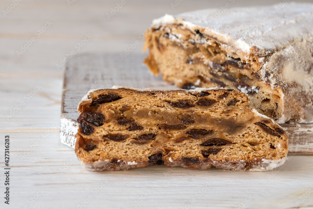 Traditional German pie from Stollen made of nuts, raisins and candied fruits, sprinkled with powdered sugar. Cutaway delicious flavored cupcake.