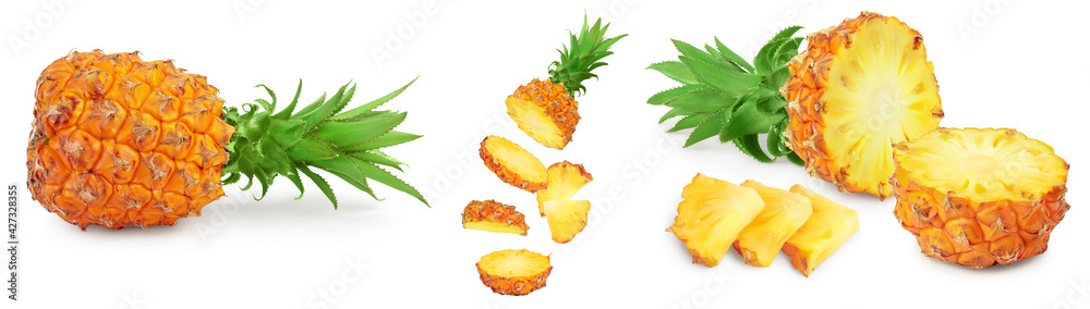 pineapple half and slices isolated on white background with full depth of field, Set or collection