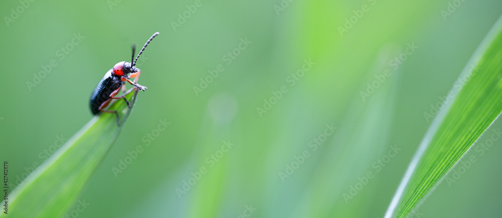Insect on blurry green background macro close up blur spring texture. Nature background.