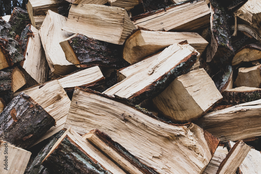 Firewood pile stacked chopped wood trunks, close-up background