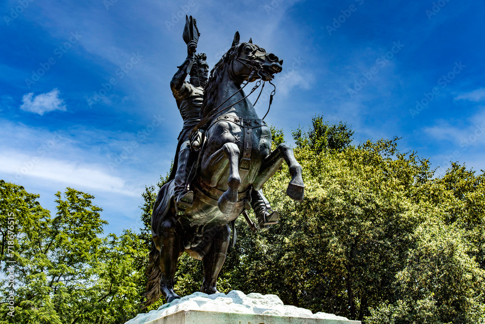 Young beautiful woman fantasy elf sits on branch of tree in spring forest. Green trees summer park. Pixie fairy girl. pink silk dress gold shiny glowing butterfly wings. Costume magic creation angel