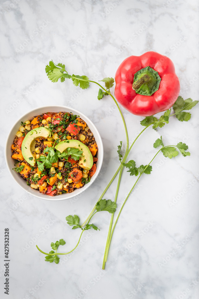 Slow cooker quinoa, sweet potato, and corn casserole with a sprig of cilantro and a red pepper.