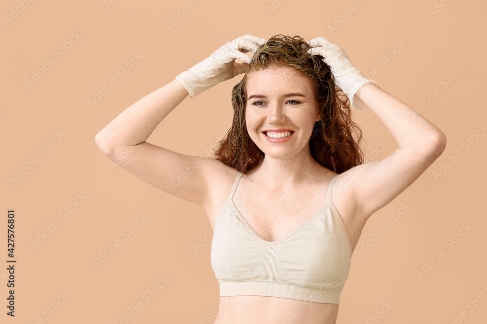 Young woman using henna hair dye on color background