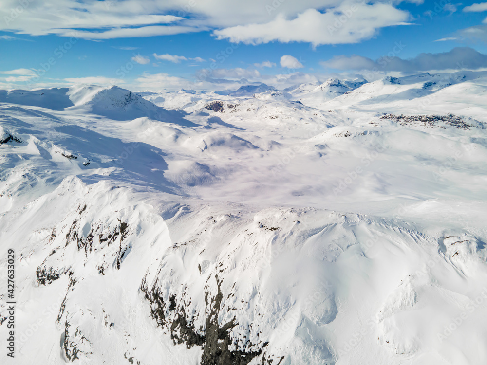 Spectacular panoramic view over snowcapped mountain peaks, ridges and frozen highland tundra in Jotunheimen, Norway.