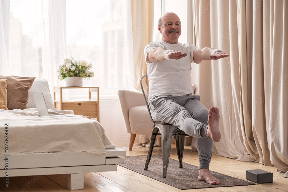 Elderly man practicing yoga asana or sport exercise for legs and hands on chair