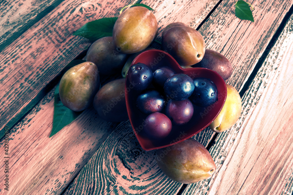 Ripe plums on a wooden surface and in a red heart-shaped plate, retro effect toned. selective focus