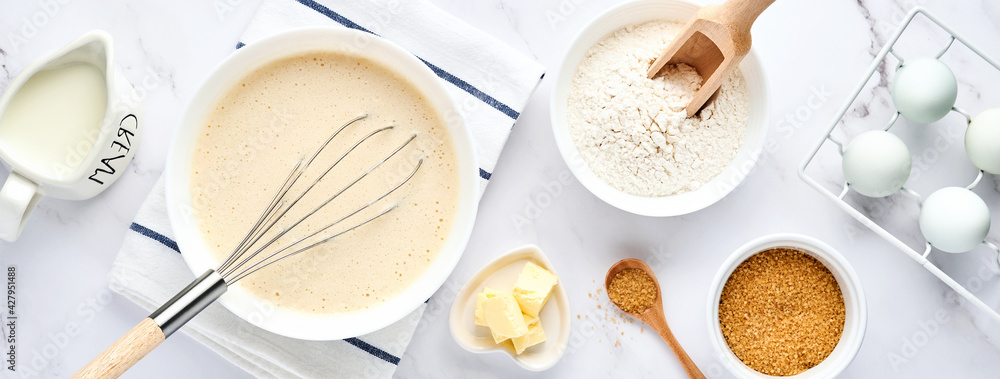 Preparation of dough for home pancakes for Breakfast or for Maslenitsa. Ingredients on the table - wheat flour, eggs, butter, sugar, salt, milk. Recipe step by step. Top view.