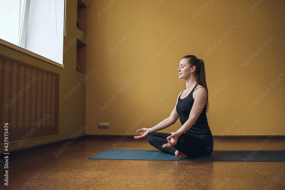 Attractive woman in black sportswear, practicing yoga, is engaged in meditation in the lotus position on a gymnastic mat in the studio near the window