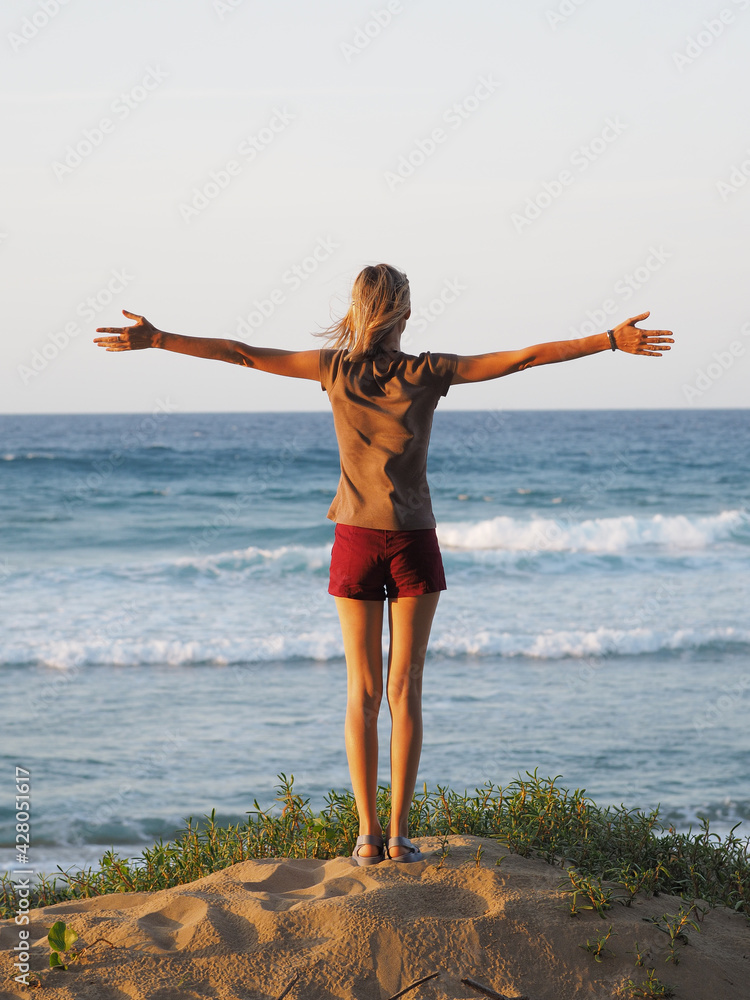 Woman enjoying beautiful views on the ocean, standing with raised hands.