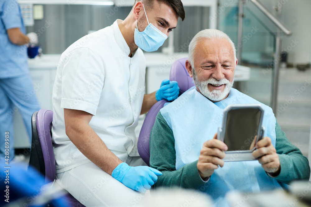 Satisfied senior man looking his teeth in a mirror after dental procedure at dentist's office.