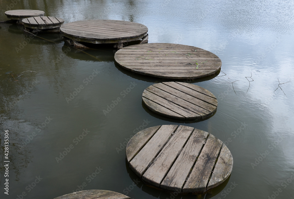 floating walkway made of wood planks. narrow curved leads above the lake water. has no railings. more design sidewalk made of individual circular boards.