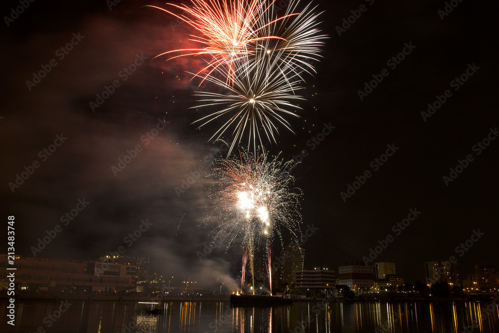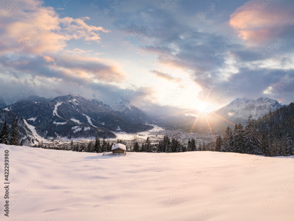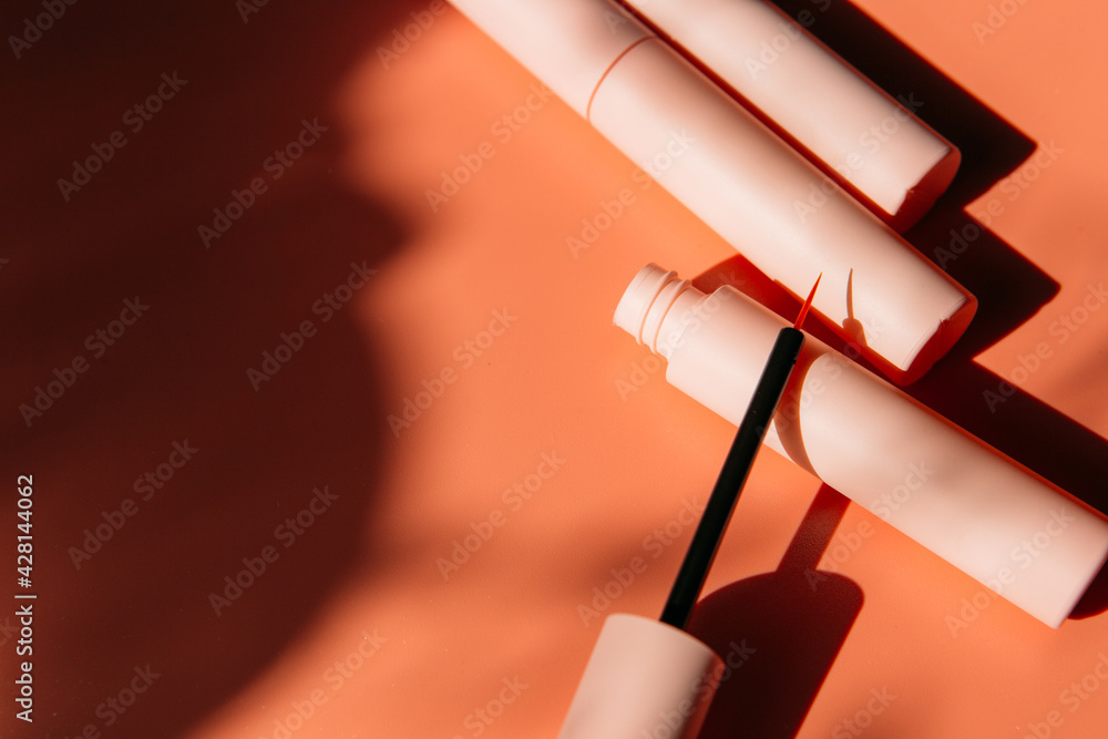 open tube with eyeliner brush next to closed pink tubes with mascara and liquid lipstick, lip gloss on a peach background with shadows