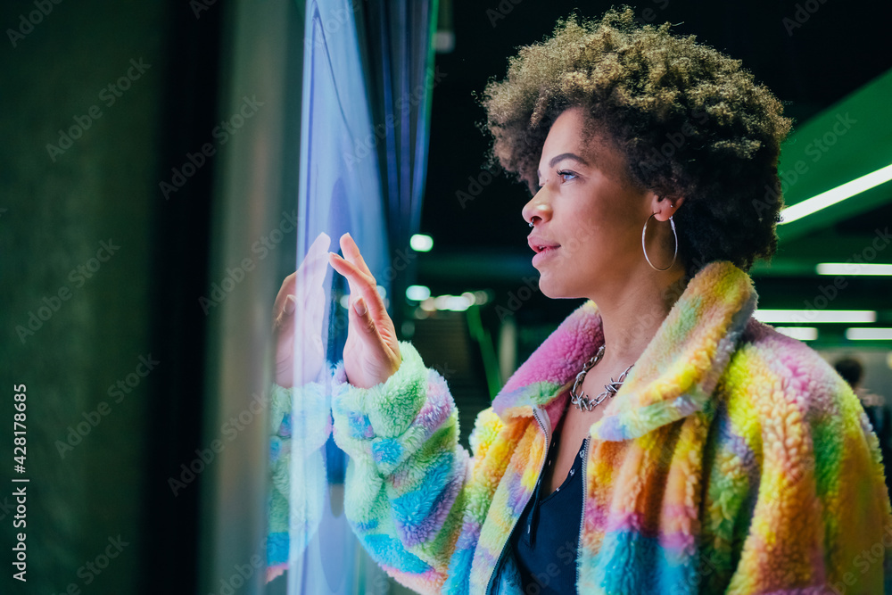 Young mixed race curly hair woman interacting with touchscreen terminal
