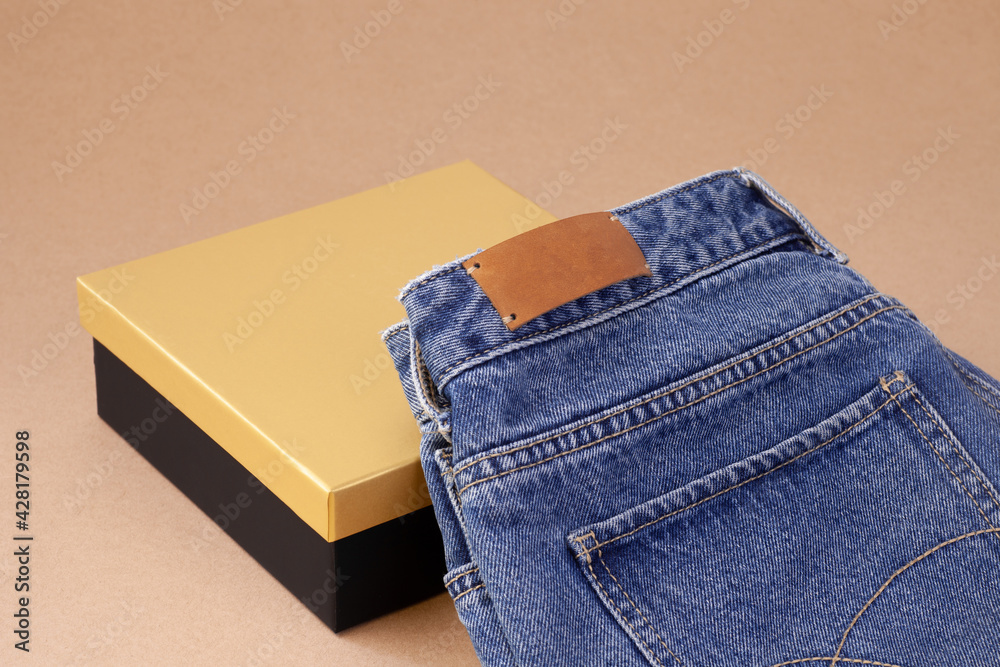 close-up leather empty tag or label on the back pocket of blue jeans on a vase of spool yarn with black golden box.