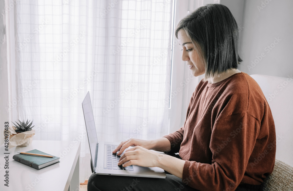 Woman writing in her laptop sitting on the sofa in her luminous living room at home with a cactus plant and a green notebook in a white table