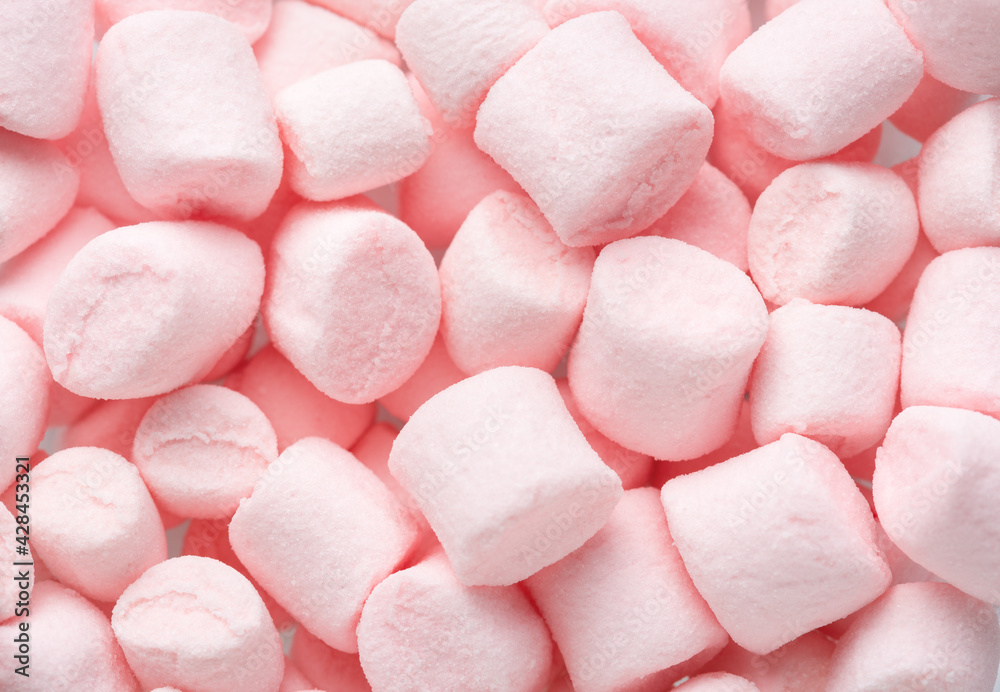 Mini marshmallows of light pink colors. Selective Focus. Flat lay.