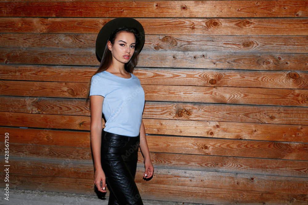 Portrait of a beautiful girl in hat, her hair straight dressed in leather pants and t shirt near the wooden wall, walking at night.