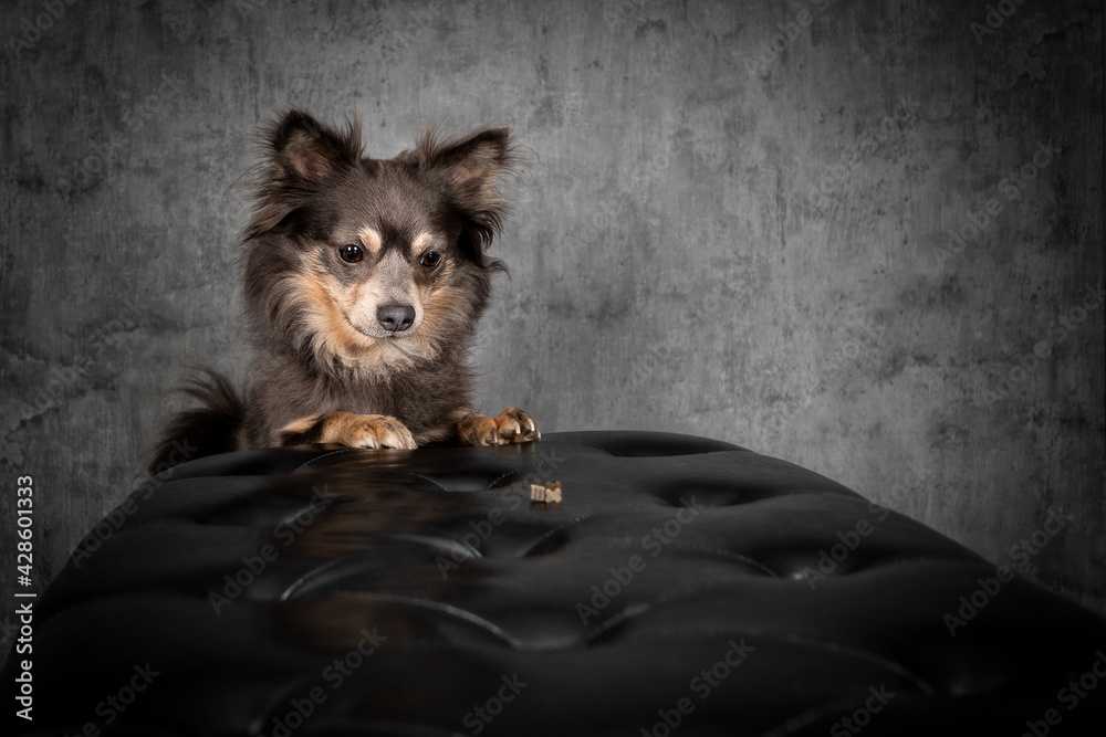 Portrait Hund auf Hocker mit Leckerlie essen und grauem Hintergrund