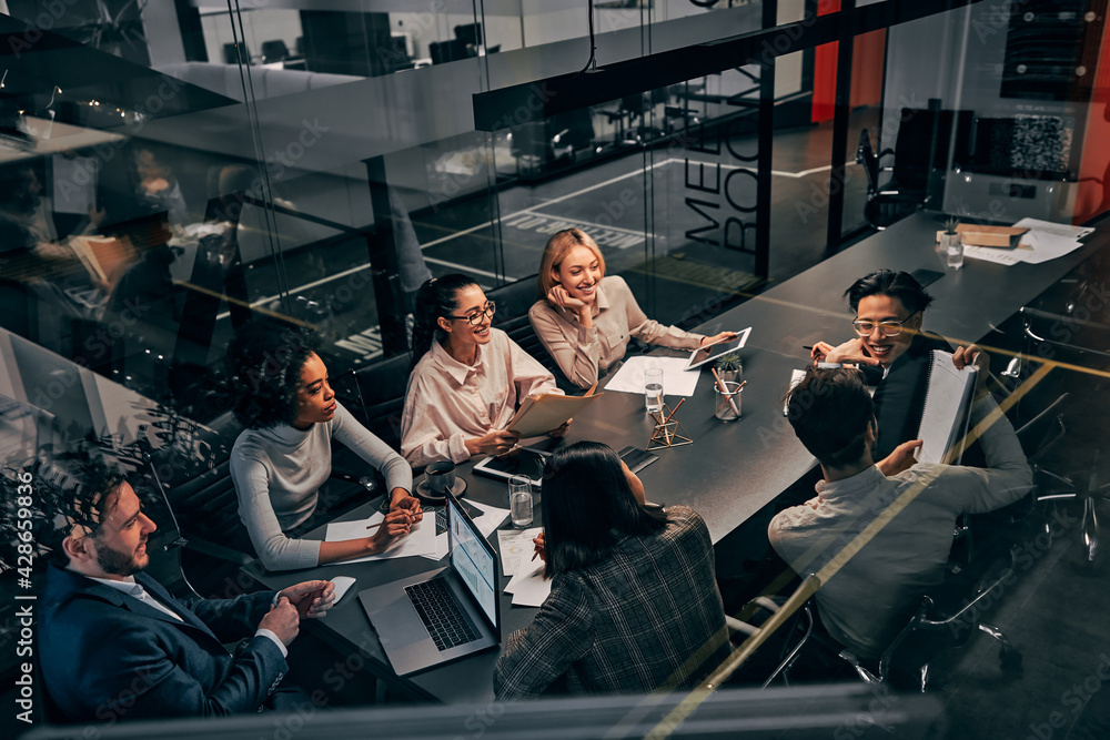 Young successful business team working in a spacious beautiful office communicating and discussing work. Concept of business, finance, strategy, management, advertising, planning.