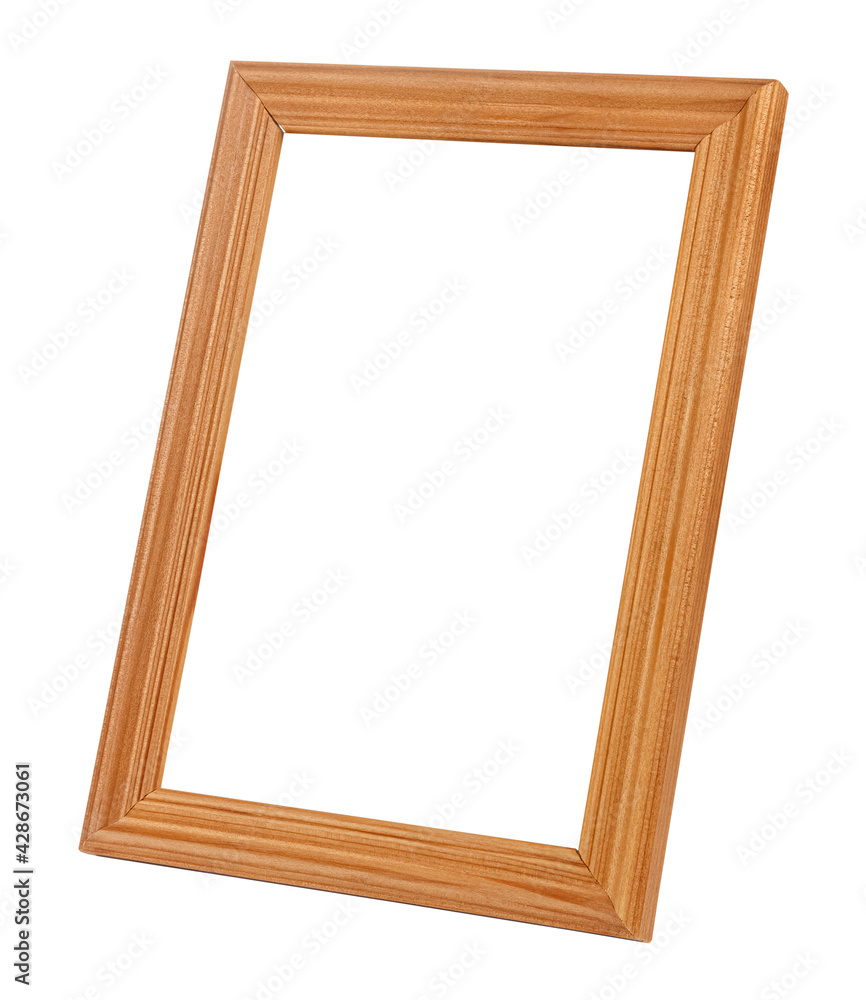 Empty wooden frame for photo or painting with pine texture border on stand isolated on white background