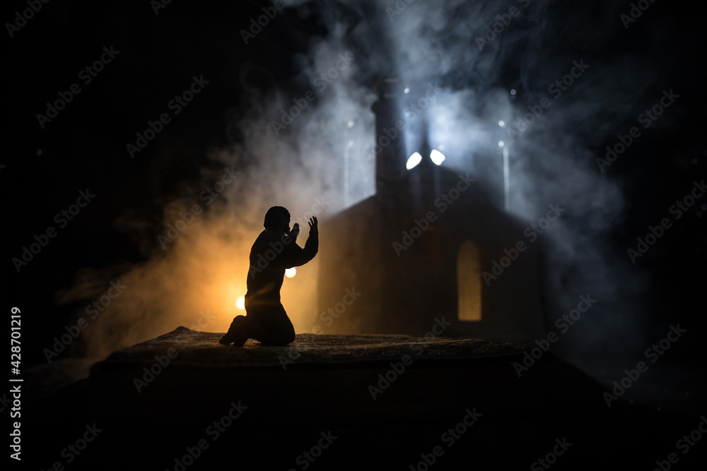 Silhouette of mosque building on toned foggy background. Ramadan Kareem background. Mosque at sunset. Praying people