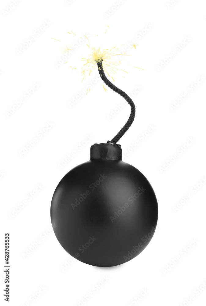 Old fashioned black bomb with lit fuse on white background