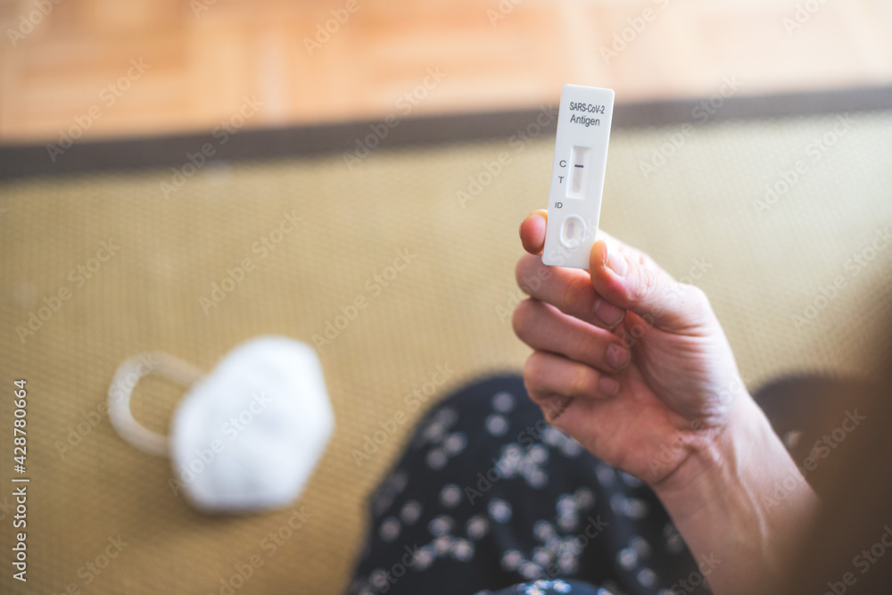 Express corona test at home: Close up of female fingers holding a negative covid antigen test, ffp2 mask in the background