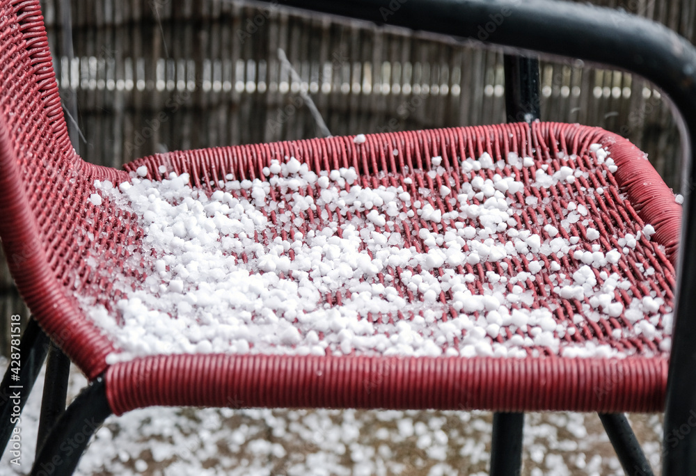 Überraschender Hagelfall, Graupelschauer mit großen, dicken Eiskörnern auf der Terrasse