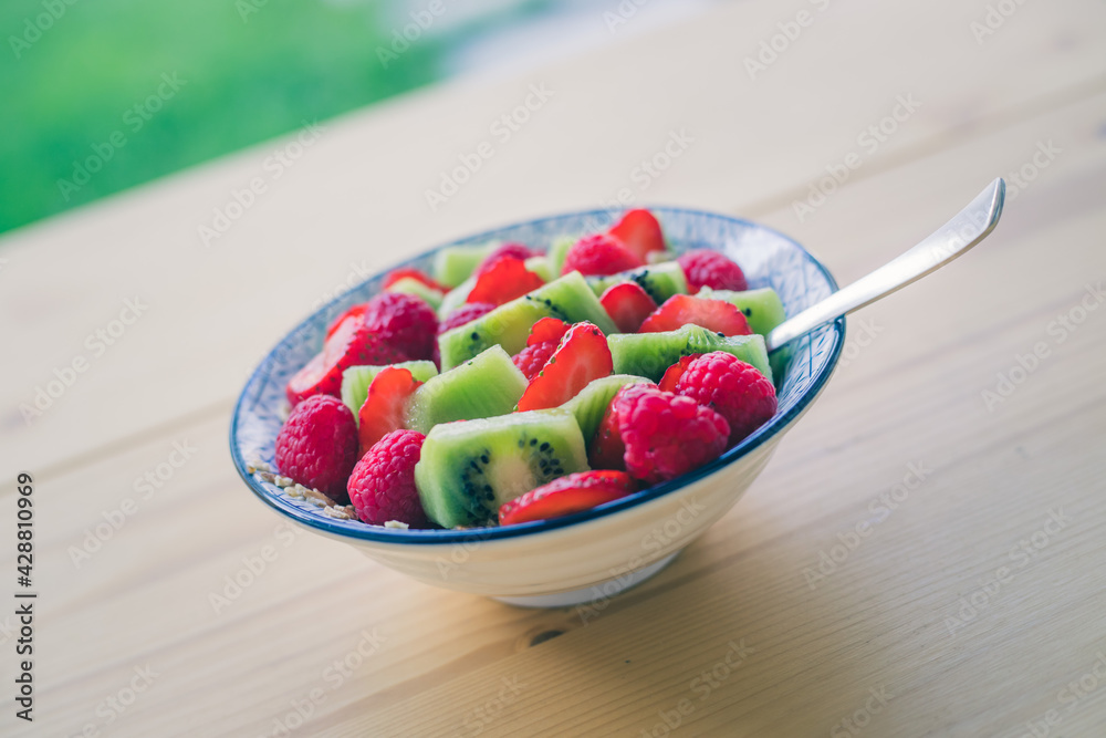 Breakfast fruit bowl with strawberries and kiwis, close up. Healthy lifestyle for vegetarians.