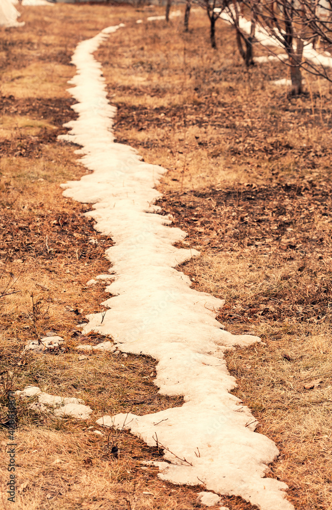 The trail of a thawed snow trail bends along a row of garden trees. Selective focus.