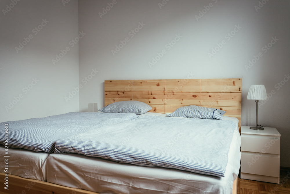 Stone pine bed: Empty wooden bed with pillow and blanket