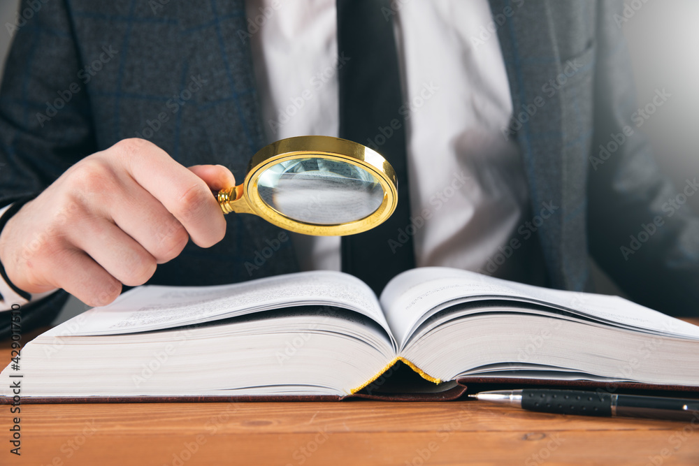 a man examines a book with a magnifying glass
