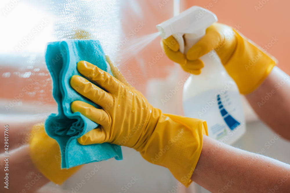 woman does household chores at home, washing the surfaces of mirrors and windows with a spray of detergent with a foam sponge.