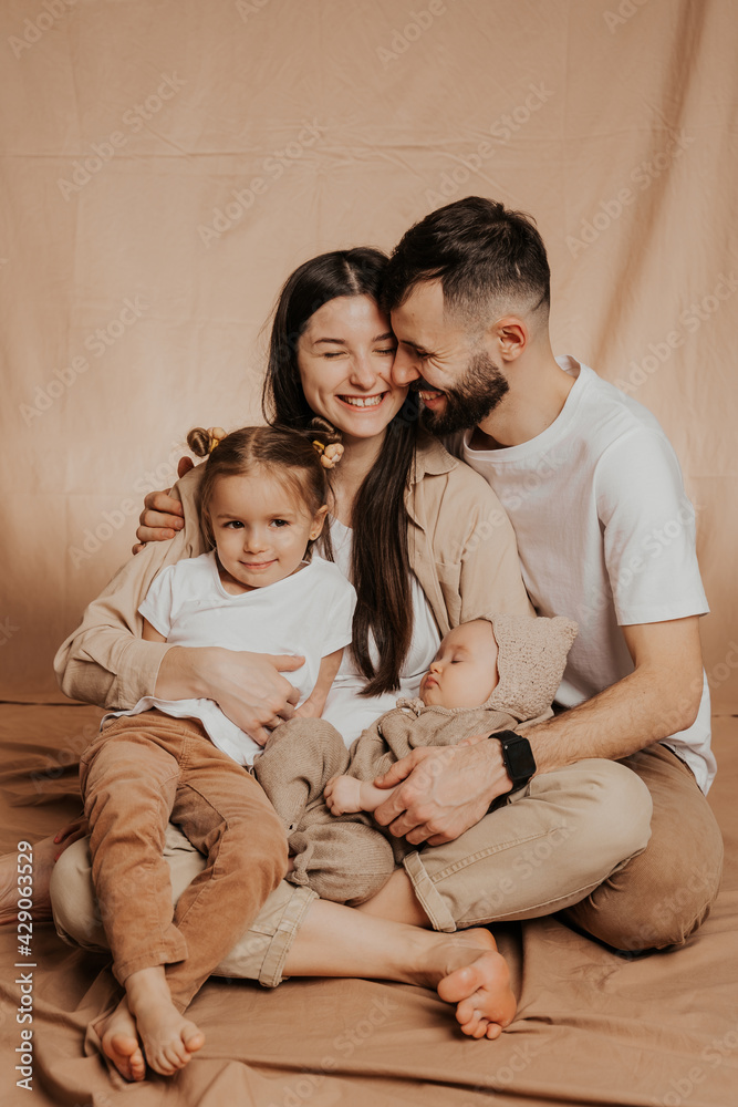 A young sincere family where a stylish bearded father and a cute wife hold their cute children in their arms. Family photo shoot in the studio