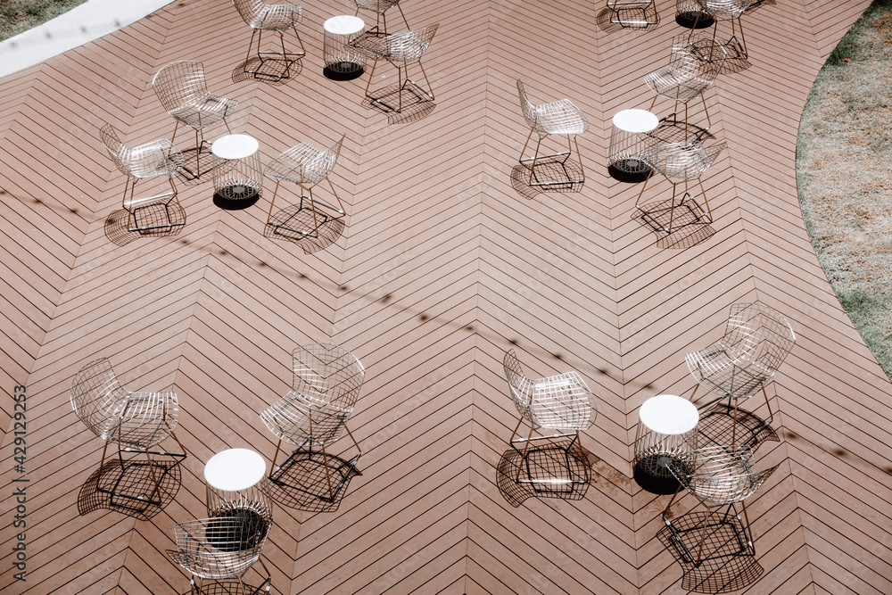 Cafe and Restaurant Empty Outdoors Seating Chair During Lockdown Covid-19 Situation. Business Food Shop and Services Affected From Coronavirus Pandemic.
