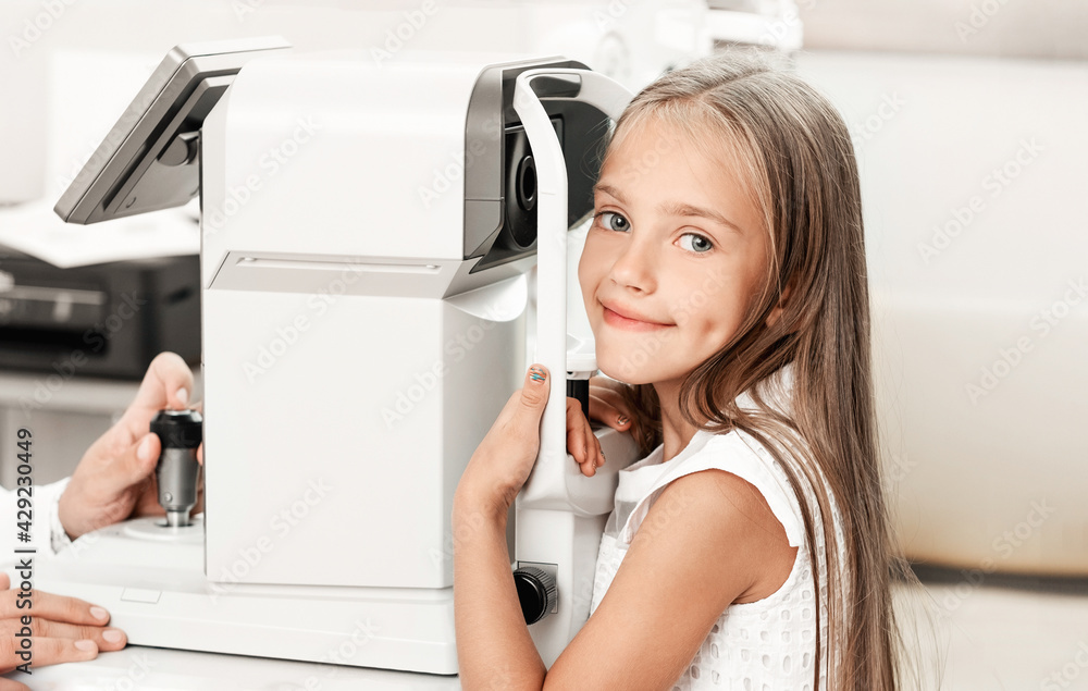 Happy little girl at ophthalmological clinic with modern equipment