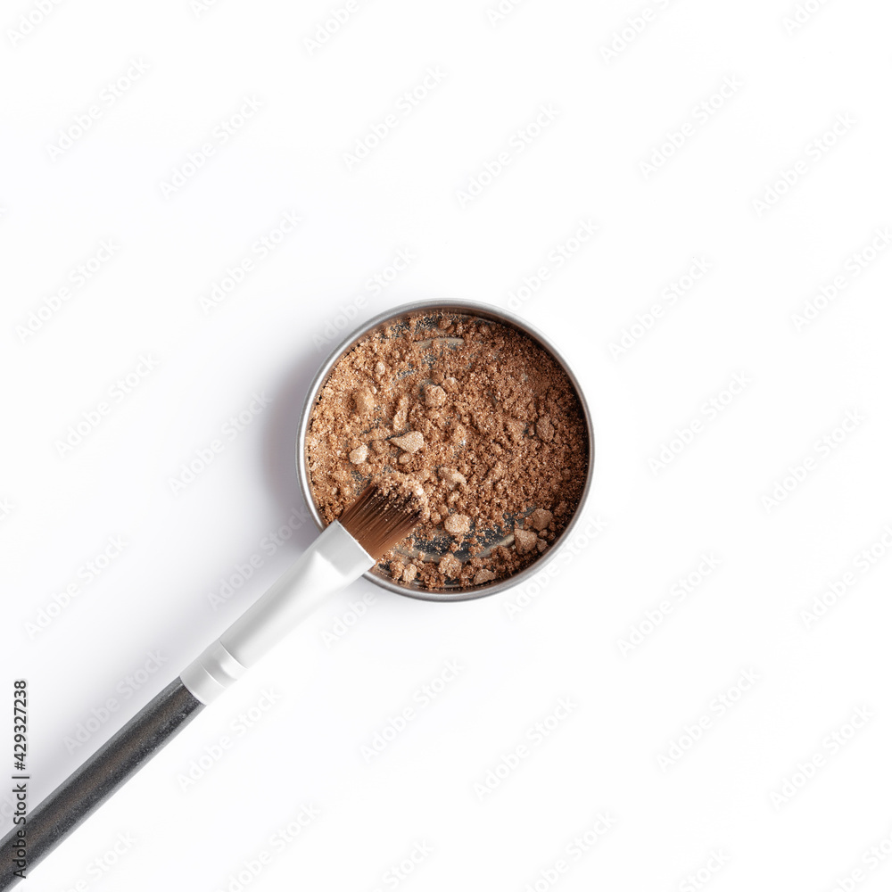 Light brown face shadow in container and eye shadow or make-up brush