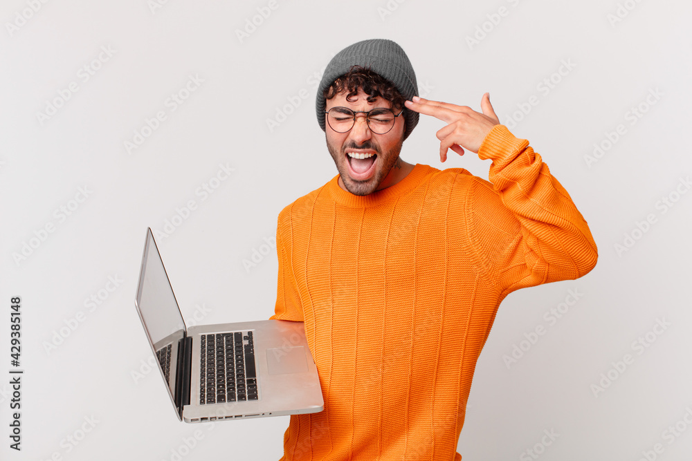 nerd man with computer looking unhappy and stressed, suicide gesture making gun sign with hand, pointing to head