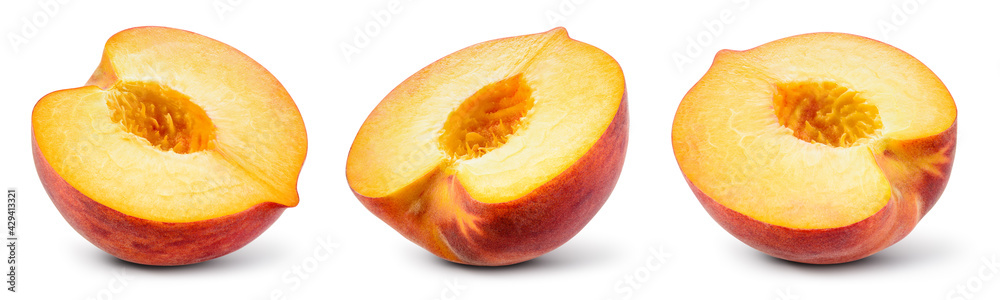 Peach half isolated. Peach slice set on white background. Peaches half collection. With clipping path.