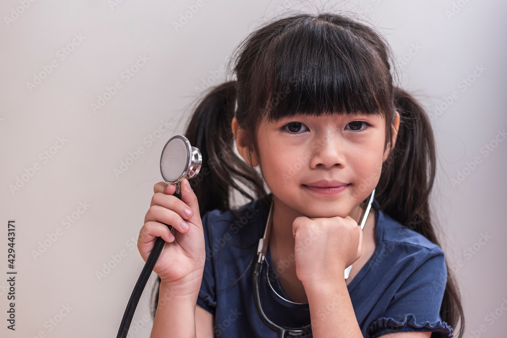 Portrait of Children, Asia girl play role as doctor with holding with toy stethoscope