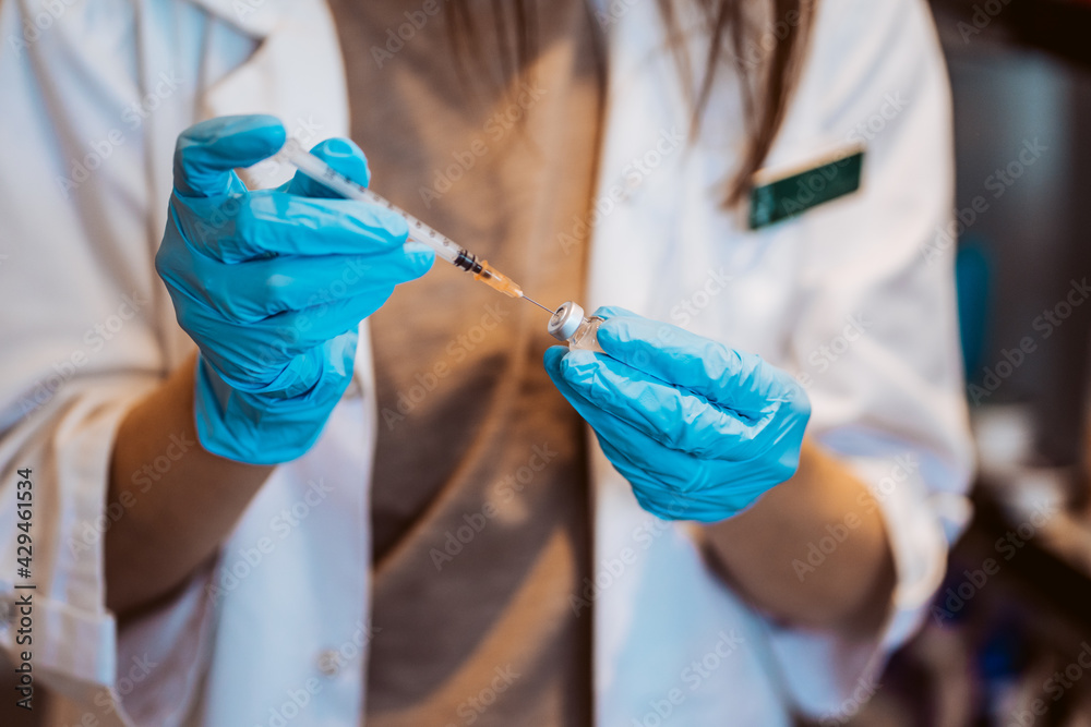 .Close up of the syringe for the covid 19 vaccine in the hands of a healthcare woman
