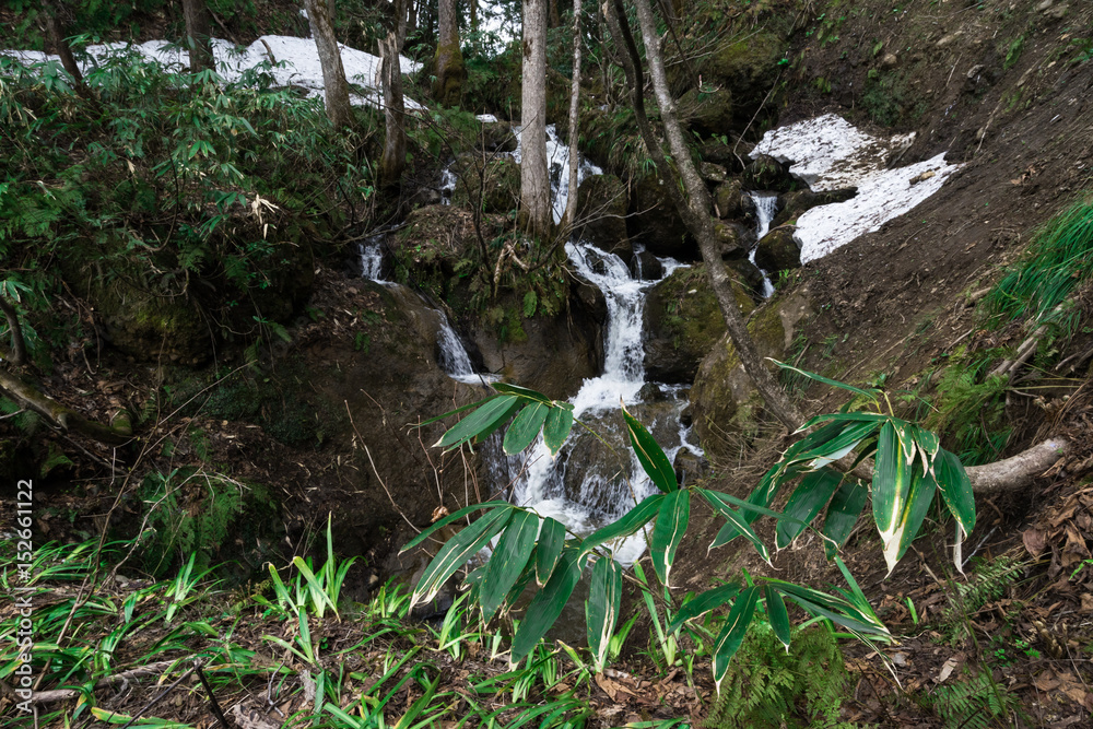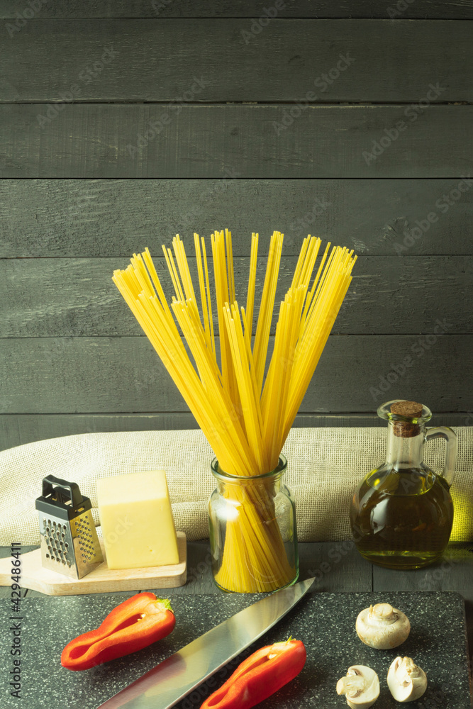 Spaghetti pasta, vegetables and spices, on a wooden table