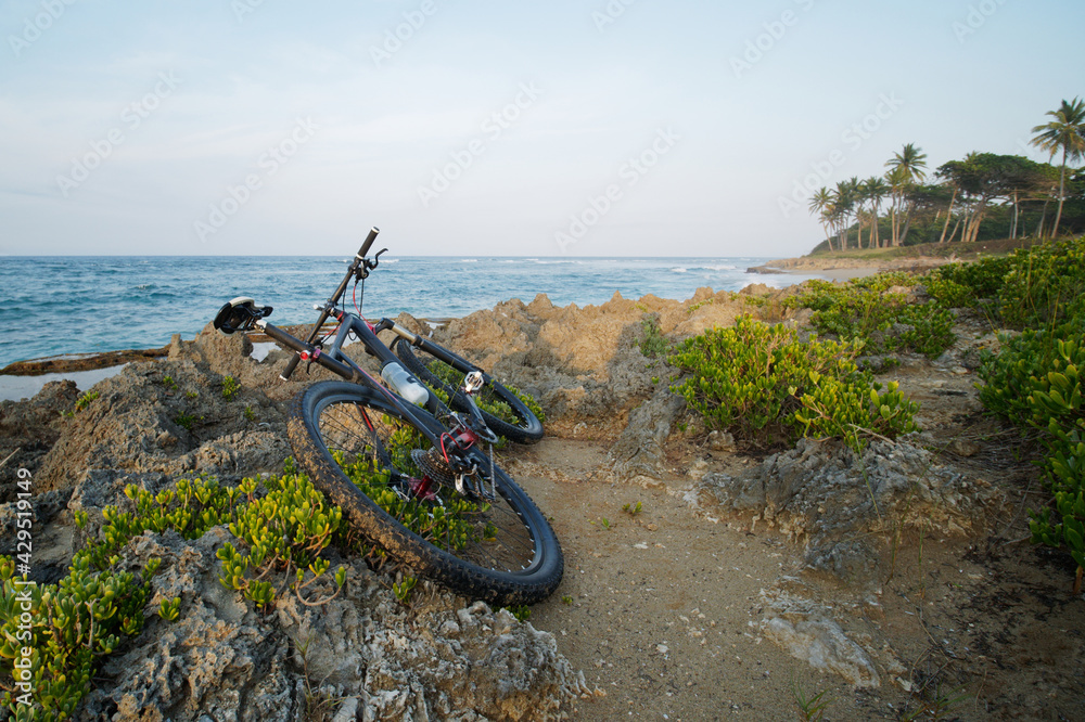 Mountain bike on ocean coast with blue sky. Surf beach..